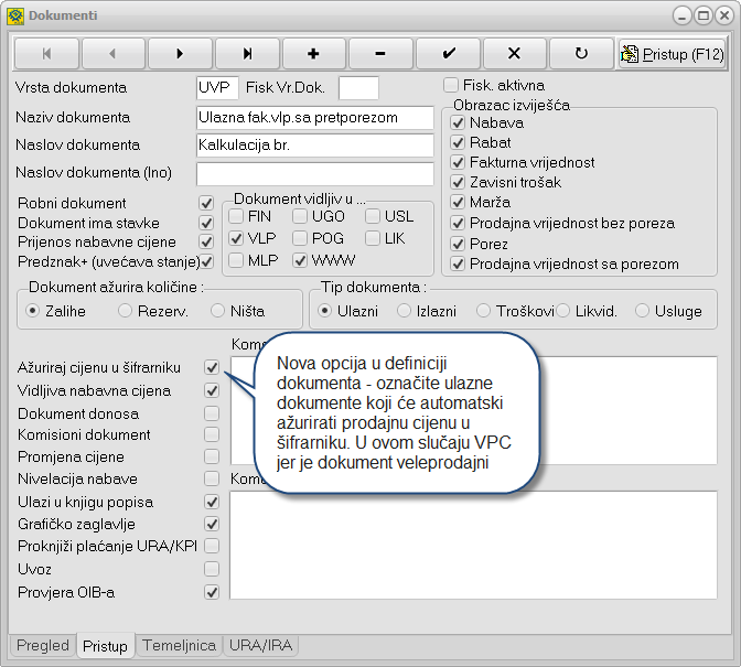 Opcija idealna za stranke koje ažuriraju jedinstveni cjenik u šifrarniku Artikala. Ovom opcijom ne morate više voditi računa o ažuriranju šifrarnika već se ono automatski obavlja čim se proknjiži ulazni dokumenti za koje ste aktivirali ovu opcije. Primjer označite dokumente UVP za automatsko ažuriranje VPC cijene i UMP za automatsko ažuriranje MPC cijene. Čim proknjižite definirane dokumente cijene u šifrarniku su ažurirane.