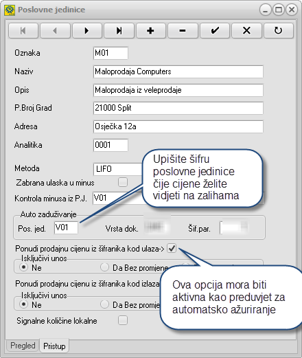 U Poslovnim jedinicama opcija Ponudi prodajnu cijenu iz šifrarnika je aktivna kao na slici.