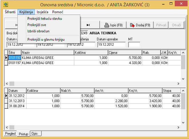 Knjiženje i lista osnovnih sredstava po mjestima troška i amortizacijskim skupinama, kontiranje i automatski prijenos primke u glavnu knjigu te knjiženje temeljnice amortizacije na nalog.