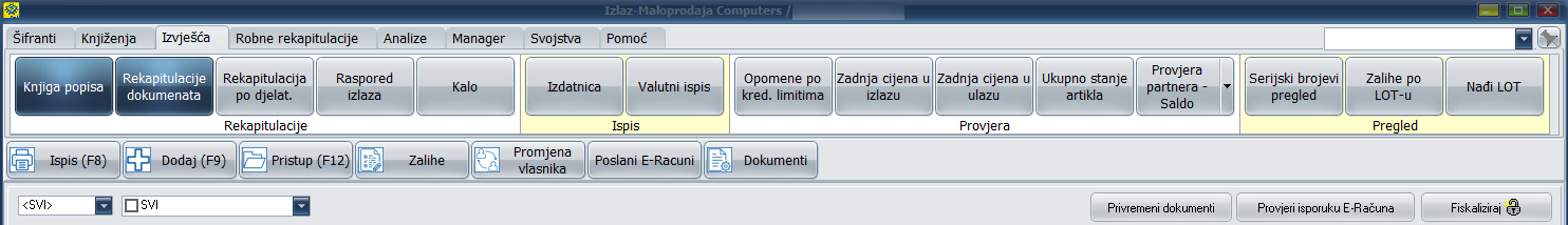 račun maloprodaje, Utržak maloprodaje, Ponuda, Izdatnica i sl. Izlaz se knjiži robno i vrijednosno. Mogućnost direktnog izvoza dokumenata kupcima unutar EDI sustava ili kao eRačun.