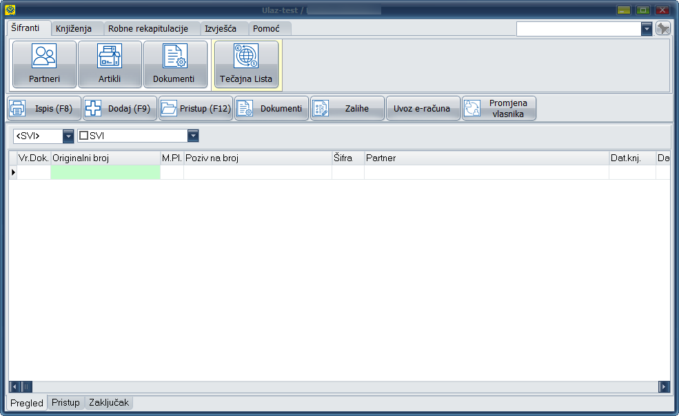 Svi ulazni dokumenti knjiže se u istoj bazi i na isti način. Prlikom knjiženja sami birate vrstu dokumenta iz naših predložaka ili otvarate nove, primjer Ulazna primka domaća, Ulazna primka uvoz, Ulaz od obrtnika, Povrat dobavljaču, Kalo …