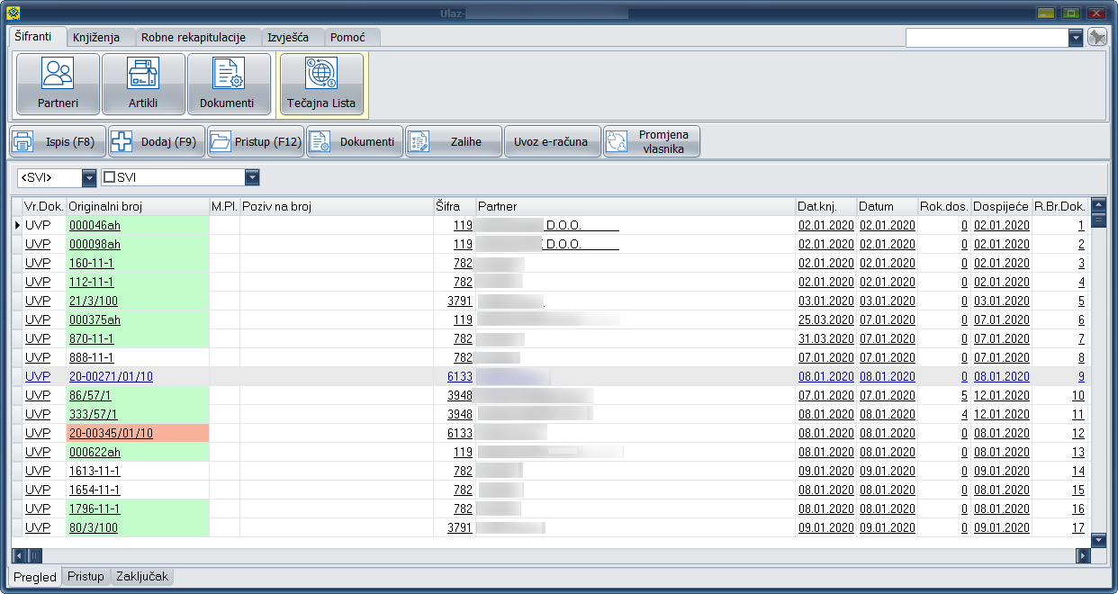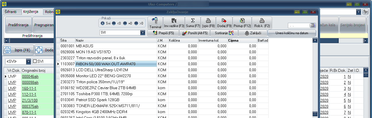 Svi ulazni dokumenti knjiže se u istoj bazi i na isti način. Prlikom knjiženja sami birate vrstu dokumenta iz naših predložaka ili otvarate nove, primjer Ulazna kalkulacija domaća, Ulazna kalkulacija uvoz EU, Ulazna kalkulacija uvoz ostale zemlje, Ulaz komisije, Povrat dobavljaču, Kalo, Zapisnik o promjeni cijene … . Tijekom knjiženja dostupna su sva izvješća i analize, pregledi zaliha po raznim kriterijima, pregled stanja u drugim poslovnim jedinicama.