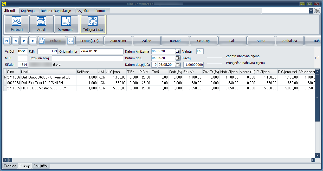 OBRAČUN NABAVNE CIJENE – podržane metode obračuna su FIFO (Prva ulazna prva izlazna), prosječna nabavna cijena i LIFO (zadnja ulazna prva izlazna). Ulazni dokumenti se mogu uvesti koristeći EDI ili eRačun.