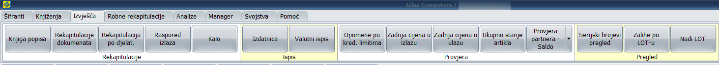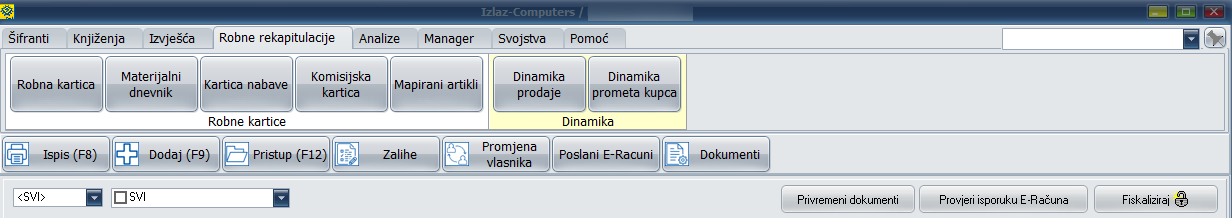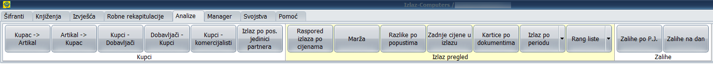 Artikal – kupac (pregled artikala, grupa ili podgrupa artikala koje kupac kupuje ili ne kupuje u zadanom periodu, pregled po dobavljačima i proizvođačima),