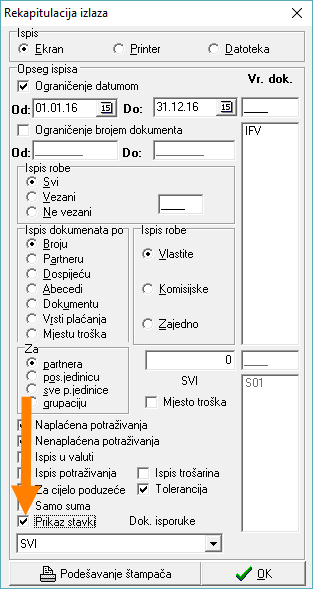 Rekapitulacija ulaza/izlaza – dodana opcija prikaz stavki po dokumentima, ukoliko je aktivirate na izvješču će se za svaki dokument prikazati stavke – artikli i usluge.