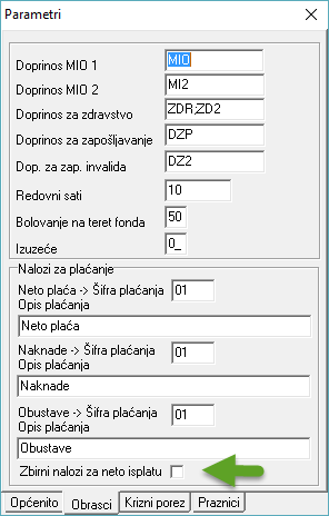 PARAMETRI / tabela OBRASCI – deaktivirati parametar Zbirni nalozi za neto isplatu.