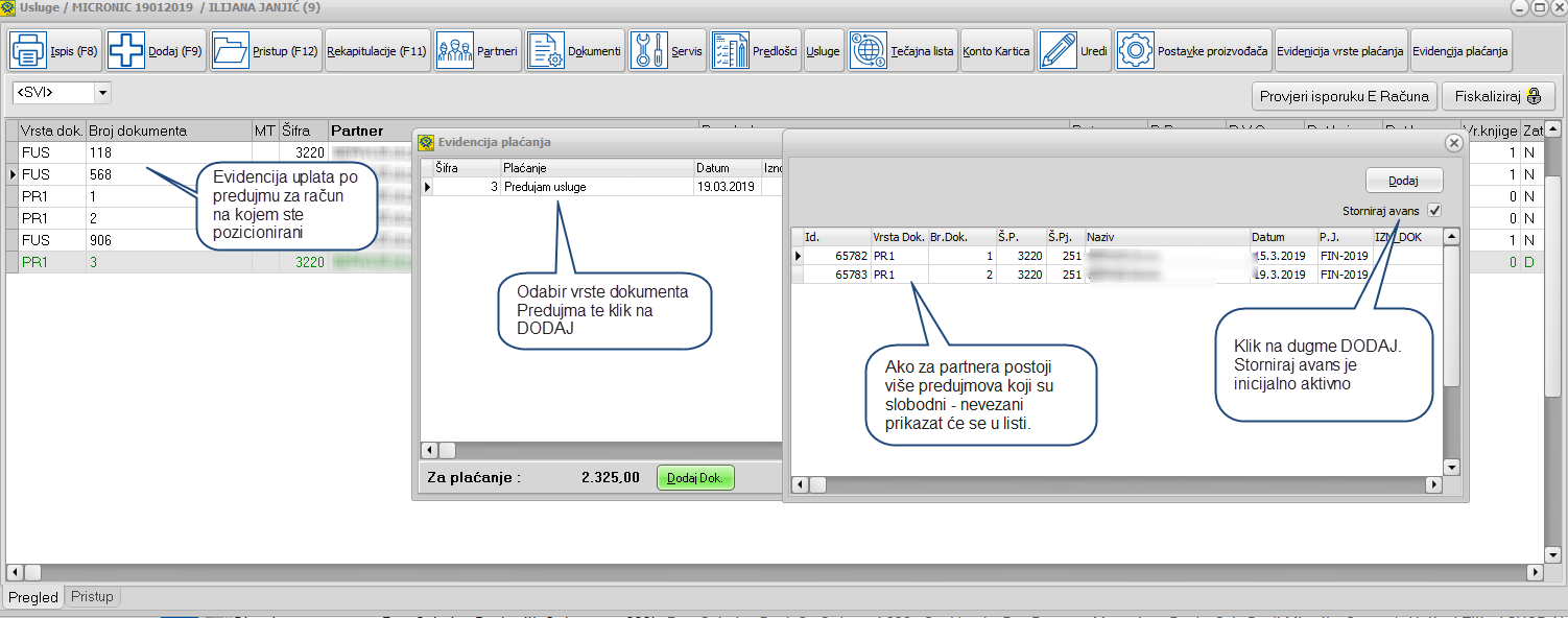 Pozicionirate se na račun te kliknete na dugme „Evidencija plaćanja“ i u polju plaćanja iz padajućeg izbornika odaberete Predujam. Klikom na dugme Dodaj Dokument dobit ćete listu nevezanih - aktivnih predujmova, pozicinorajte se na željeni te klik na dugme Dodaj vežete ga sa računom. Ukoliko želite vezati još jedan predujam na isti račun spustite se u novi red i ponovite postupak. Na taj način možete vezati n računa za predujam na jedan račun. Primjer na slici dolje.