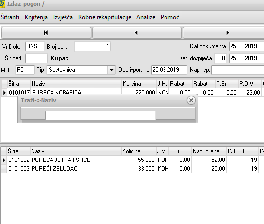 Dodana opcija F5 TRAŽI unutar dokumenta Radni nalog u Pogon izlaz. Traži u tabeli i polju na kojem ste pozicionirani.