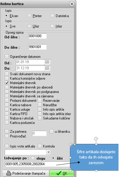 Dodana opcija ispisa materijalnog dnevnika za određene šifre - šifre koje odaberete za ispis. Dodajete ih na način kako je prikazano na slici dolje. Moguć je i copy/paste šifara artikala.