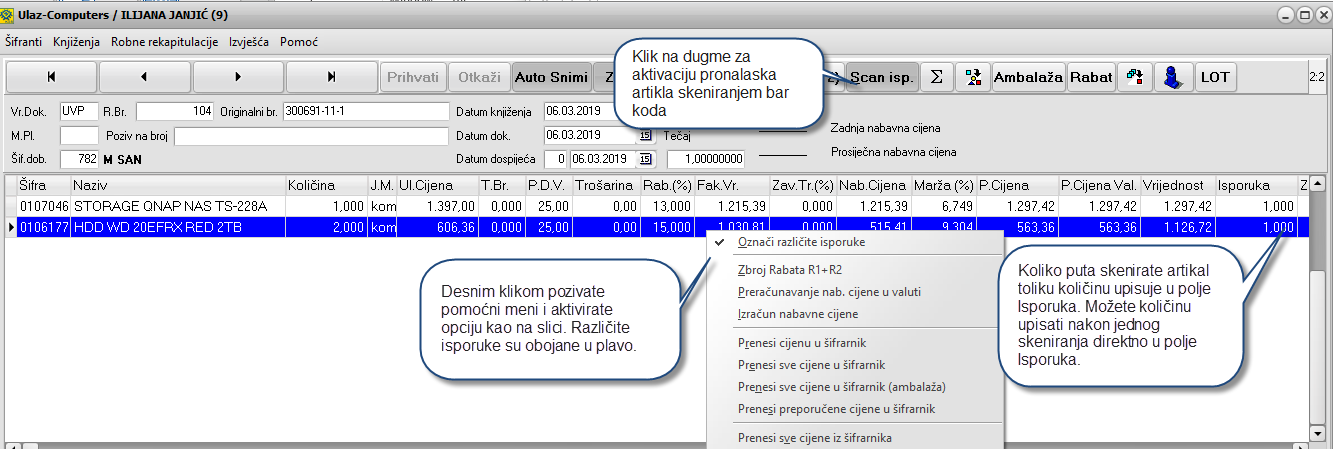 Nakon aktivacije u gornjem desnom kutu bar kod čitačem očitate artikle i program u polje isporuke upisuje učitanu količinu. Ukoliko primjerice imate 5 istih arikala potrebno je 5 puta bar kod čitačem kliknuti na bar kod artikla - očitati artikal i u polje isporuke će se upisati broj 5. Možete količinu upisati i ručno nakon prvog skeniranja, kako god Vam je praktičnije. - Da bi dobili informaciju ima li na nekim artiklima razlike između unešene količine po dokumentu i količine koja je skenirana bar kod čitačem i upisana u polje isporuke potrebno je desnim klikom miša pozvati prozor pomoćnog menija te aktivirati opciju „Označi različite isporuke“. Pokretanjem ove opcije program plavom bojom označi artikle kod kojih se količine razlikuju. Kao na slici dolje.