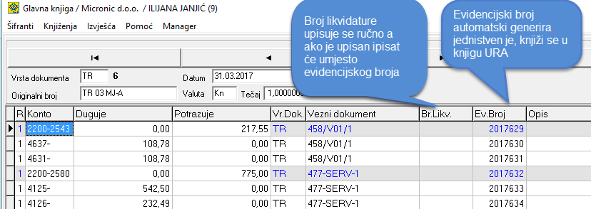 BROJ LIKVIDATURE – u ovo polje možete upisati oznaku po želji kao identifikacijsku oznaku knjiženja, ukoliko želite oznaku po svojoj organizacijskoj shemi i logici. Ako je upisan broj likvidature isti će se i ispisati umjesto evidencijskog broja na ispisu temeljnice te evidentirati u knjigu URA.Evidencijski broj i broj likvidature su samo naši prijedlozi za identifikacijsku oznaku dokumenta, možete koristiti i broj temeljnice, originalni broj dokumenta i/ili vezni dokument.