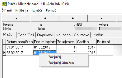 Opciju Zaključaj koristite u slučaju kad želite zaključati obračun za konkretnog radnika, a opciju Zaključaj Obračun koristite kad zaključati obračun želite svim radnicima za određeni mjesec. Zaključani obračuni će na ovaj način bit podcrtani i ne mogu se mjenjati. U slučaju potrebe za promjenom potrebno je prvo otključati obračun.