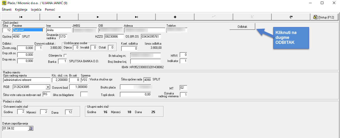 3. Korak – Da bi program automatski izračunao koeficijent odbitka za djecu i uzdržavane osobe po novim faktorima (koeficijentima) potrebno je pristupiti u opće podatke bilo kojeg radnika i kliknuti na dugme „Odbitak”.
