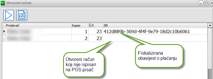Kako ćete znati koji je sa liste otvorenih računa ispisan i fiskaliziran kao Obavijest o plaćanju? U listi otvorenih računa to su oni imaju upisan ZKI i JIR, kao na slici dolje.