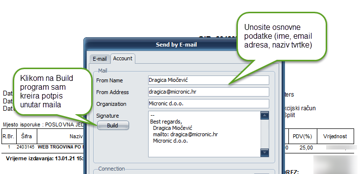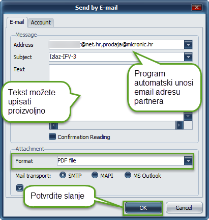Program automatski unosi email adresu partnera iz dokumenta a na Vama je da potvrdite slanje i po želji unesete tekst unutar emaila.