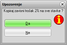 Ulaz/ Izrada ulaznih dokumenata - dodana mogućnost kopiranja marže, rabata, zavisnog troška s prve stavke na sve ostale stavke u dokumentu - pozicionirajte se na polje koje želite kopirati i dvoklik mišem dobit ćete upit kao na slici