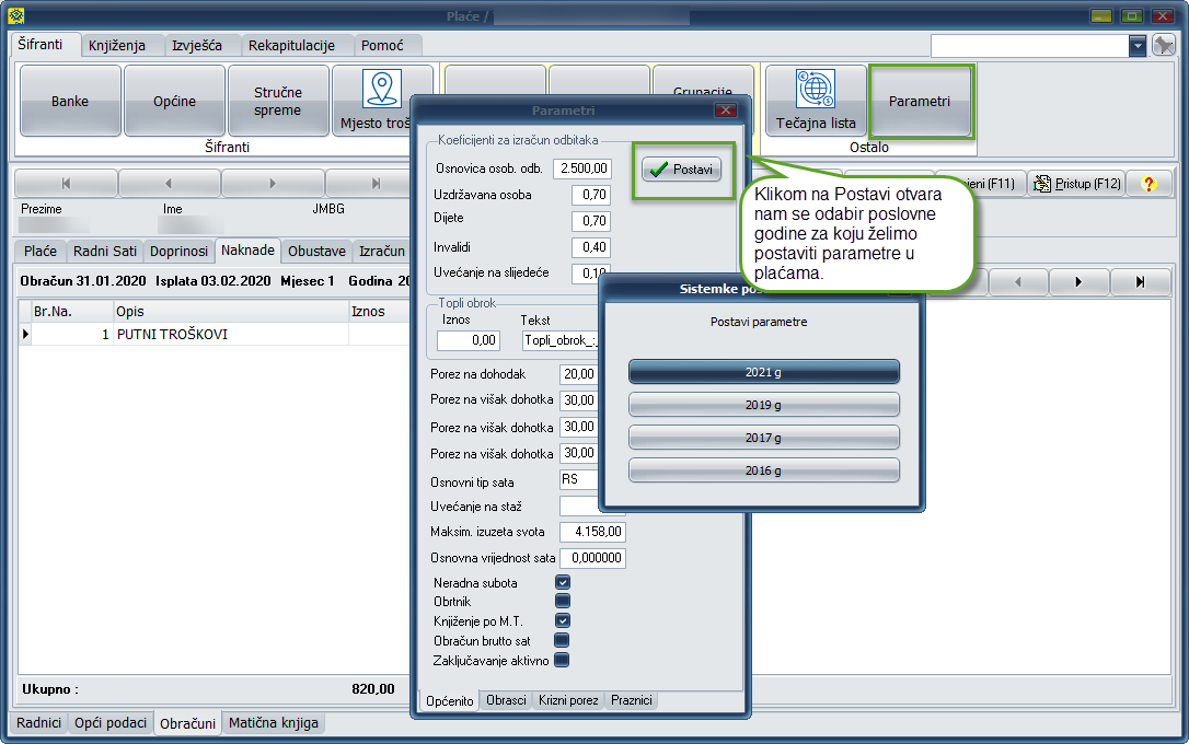 Nakon preuzimanja Nove verzije unutar modula Plaće pristupite u Šifranti/Parametri/Postavi - postavi parametre 2021. Program će automatski unijeti nove stope poreza na dohodak.