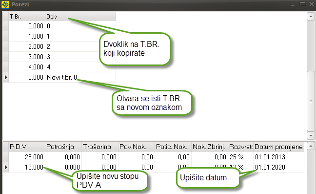 U verzijama KIS i KASA starijima od 09/0018 ne postoji mogućnost kopiranja T.BR. na gore opisani način. U tom slučaju sami ćete otvoriti novi T.BR - pozicionirajte se na posljednji T.BR. u tablici te strelicom dolje otvorite red, zatim se prebacite u tablicu u kojoj su stope PDV-a (kao na slici) te definirajte novu stopu od 01.01.2020.